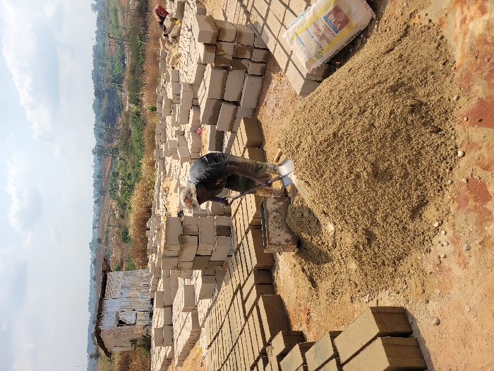An outdoor, daytime scene in Nwofia, Nigeria, depicts a block-making operation