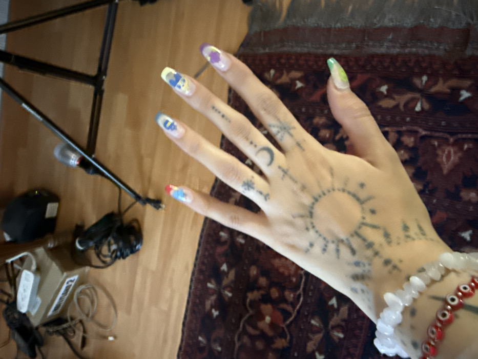 A fair-skinned hand, adorned with celestial tattoos of crescent moons, stars, and a sun, rests on a dark, patterned rug. The fingernails are painted with vibrant, mismatched designs. The wrist is accessorized with a white, beaded bracelet and a red evil eye bracelet. To the left, a floor, a microphone stand, a black microphone case, and some cables are visible.