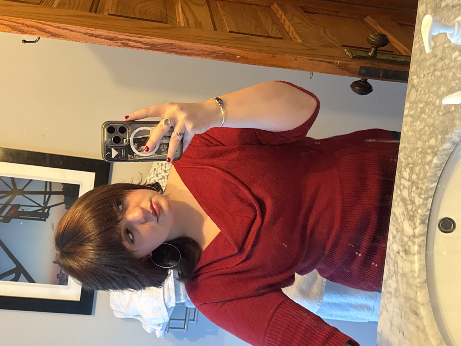 A woman in a red sweater poses in a mirror selfie