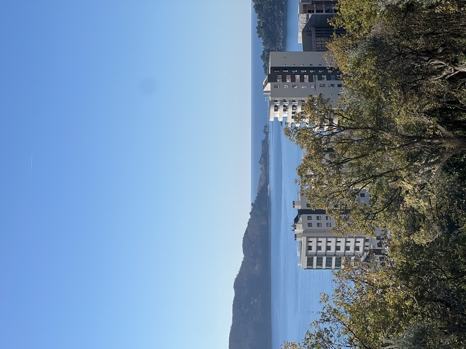 The image displays a panoramic view of the coastal town of Rafailovići, Montenegro, under a clear, bright blue sky with a faint contrail visible in the upper left. The scene is dominated by a large body of calm blue water, likely the Adriatic Sea, with forested hills and smaller landmasses visible across it in the distance, defining a bay or inlet. In the midground, several modern, multi-story residential buildings are visible. One prominent building on the left is light-colored with numerous dark-framed windows, and another on the right features a mix of light and dark facades with balconies. The foreground consists of dense, green and autumnal-toned deciduous trees and shrubs, obscuring the lower portions of the buildings and framing the view. No individuals or specific actions are discernible within the frame.