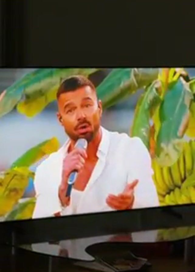 man singing into a microphone. He has short brown hair, a beard, and is wearing a white shirt. The background behind him appears to be foliage and bananas. The scene is being displayed on a television screen with a reflective black base. A small dish with items inside is visible on the stand below the television.
