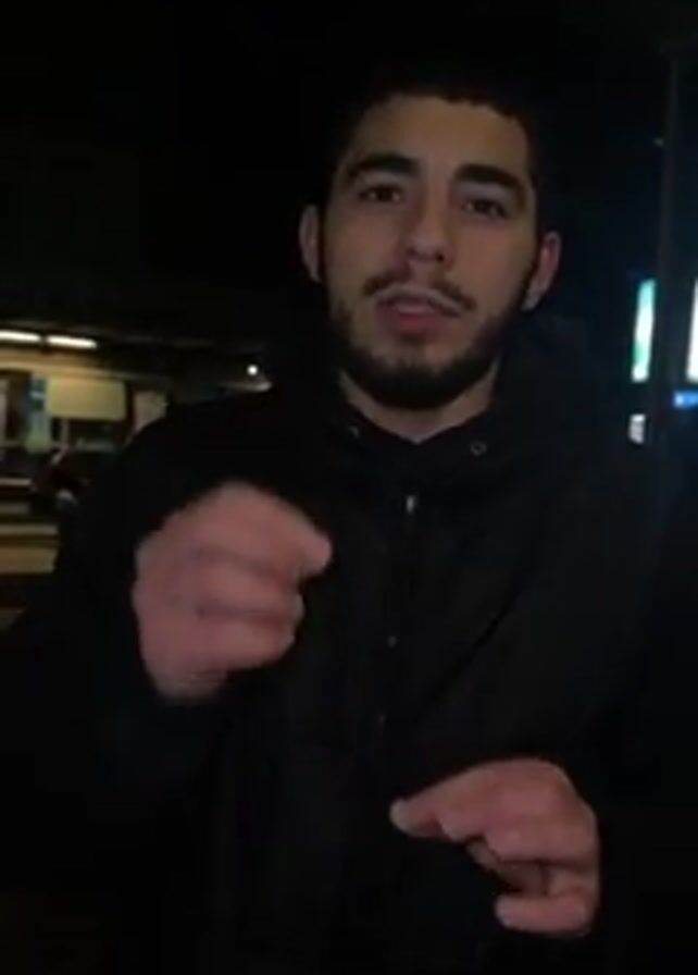 A man is speaking to the camera, holding a cigarette filter between his fingers and then holding it up to the camera. The camera pans out to show the nighttime street, and then a trash can next to a bus stop. It pans again to show the street.