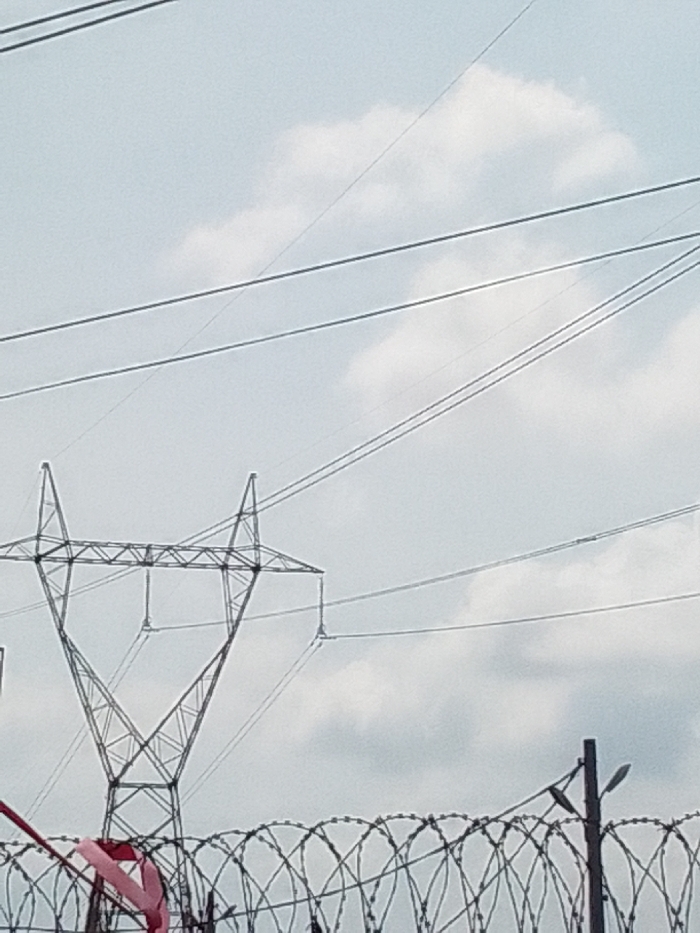 The scene, located in Oba-Aboji, Nigeria, presents an urban landscape under a partially clouded sky. A prominent lattice-style electrical transmission tower, featuring a distinctive "cat ear" top structure, occupies the left mid-ground, supporting multiple overhead power lines that traverse the frame. In the immediate foreground, a continuous coil of razor wire forms a barrier, extending horizontally across the lower section. A dark utility pole with an attached street light fixture is visible on the far right, positioned behind the razor wire. A segment of reddish-pink ribbon or fabric is observed near the base of the transmission tower, partially obscured by the razor wire. No individuals or discernible activities are present.