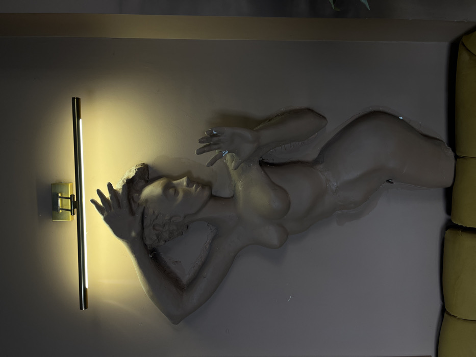 An interior scene at Sense Hotel Sofia, Bulgaria, features a light-colored bas-relief sculpture of a nude female figure mounted on a light taupe wall. The sculpture depicts the upper torso and head of a woman with arms raised, hands near the head and chest, and a downcast expression. A horizontal, brass-toned LED picture light is positioned directly above the sculpture, casting a warm yellow light downward onto its surface. The top of a mustard-yellow upholstered sofa is visible at the bottom of the frame, and a darker partition or wall element occupies the right edge.