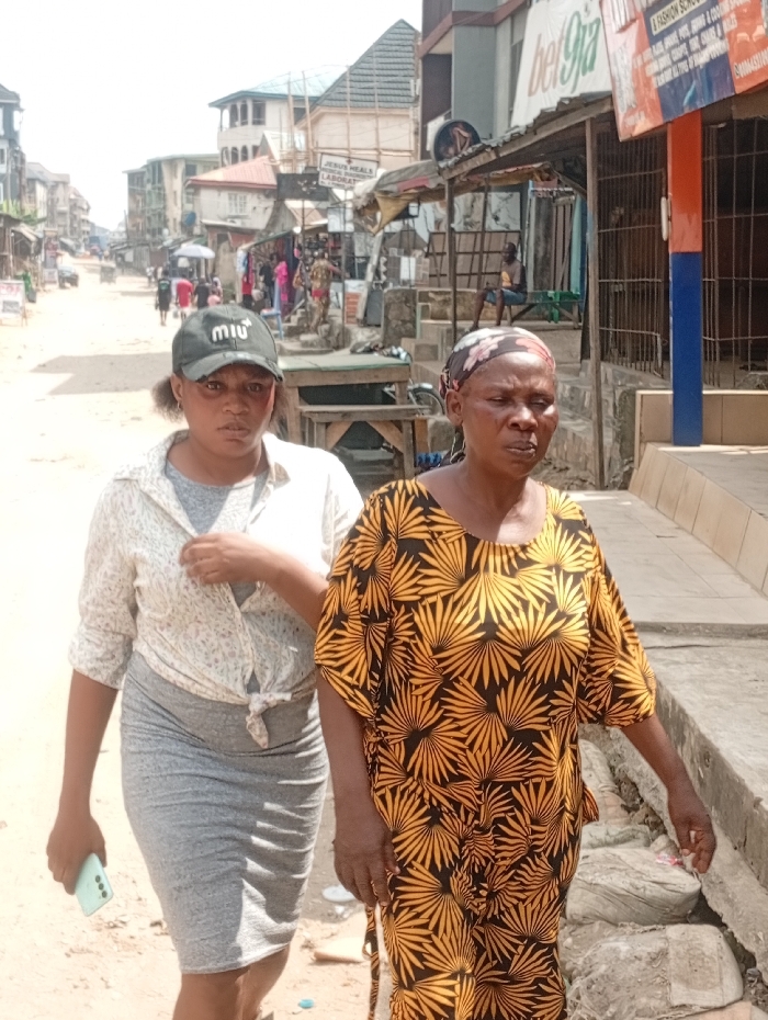 Two women walk along a street. The younger woman wears a "MIU" branded cap, a knotted shirt, and a grey skirt, holding a phone. The older woman wears a patterned headscarf and a loose-fitting yellow dress with black designs. The street shows shops, buildings, and pedestrians. The atmosphere appears busy and urban.