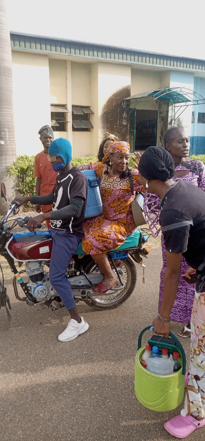 The scene is set on a paved road in Kaninkon, Nigeria, with a light-colored building featuring multiple louvered windows and an arched entrance canopy in the background. A prominent palm tree stands on the far left. In the foreground, a young male, wearing a blue balaclava, a blue surgical mask, a black long-sleeved shirt with white graphics, blue sweatpants, and white sneakers, sits astride a red and blue "BOXER" brand motorcycle. His hands are on the handlebars. A light blue backpack is visible on his back. Behind the driver, an older female passenger is seated on the motorcycle. She wears a colorful patterned dress in shades of pink, orange, and brown, a matching headwrap, and red open-toed sandals. A light blue, rigid cooler is positioned on her lap. She is looking towards the right and appears to be gesturing with her left hand. To the right of the motorcycle, a female individual, wearing a patterned purple top, stands looking to the right. Further to the right, partially visible, another female holds a green plastic bucket containing several plastic bottles (including a Coca-Cola bottle and others with blue and red caps) and a white plastic bag. This individual wears pink Crocs. Behind the driver and the older female passenger, a male in an orange tunic and a patterned cap stands, smiling towards the left. A second female, largely obscured, with a dark headwrap, is visible behind the older female passenger. The motorcycle has a blue license plate, partially visible as "G-7306".
