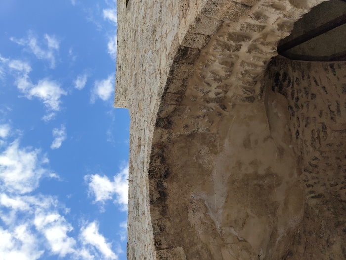 A weathered stone archway curves across the frame, its rough, aged texture contrasting with a bright blue sky dotted with fluffy white clouds. The stone is a light, creamy color with darker, shadowed areas highlighting the individual blocks. A dark horizontal beam sits just inside the upper arch. The structure appears old and possibly part of a larger building. The perspective is from below, looking upwards towards the sky.