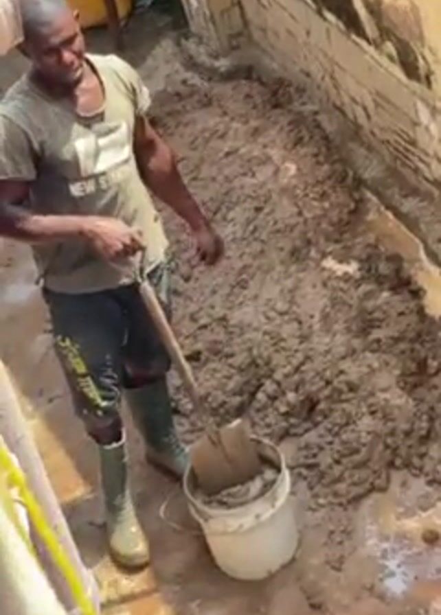 A man wearing a t-shirt, shorts, and rubber boots is using a shovel to mix mud in an outdoor area. He is standing in the mud, which covers a rectangular space. A white bucket sits next to him, partially filled with the mud. A yellow container is visible in the background, and the area is bordered by a wall.