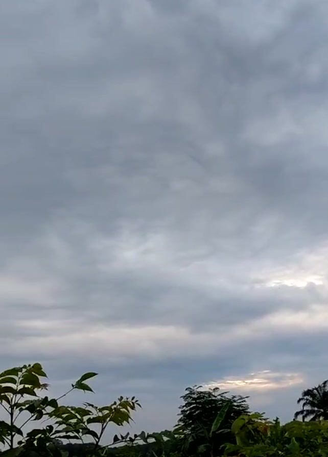 The video presents a view of a landscape under a cloudy, overcast sky. The tops of trees and other vegetation are visible in the foreground, with a break in the cloud cover allowing some sunlight to peek through near the horizon. There are no people visible in the frame.