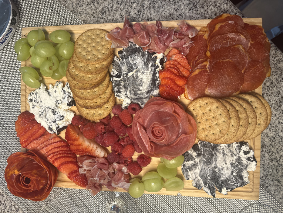 - "A rectangular wooden charcuterie board is presented on a speckled gray countertop, with a gray textured placemat visible on the left" by FM-avfjN2, licensed under CC BY 4.0