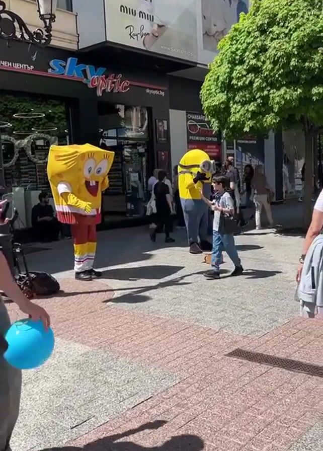 street scene with two individuals dressed as cartoon characters, SpongeBob SquarePants and a Minion. They are standing on a sidewalk near a Sky Optic store, engaging with people passing by. A young boy interacts with SpongeBob, while others are taking photos of the characters. The surroundings include pedestrians walking by, store signs, a tree, and luggage. The area appears to be a bustling commercial district on a sunny day.