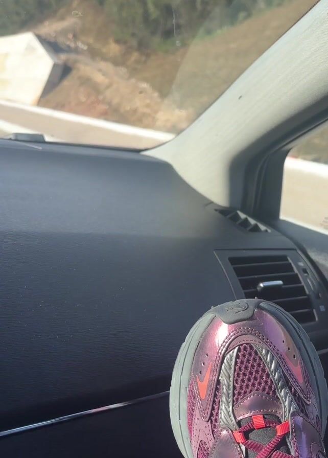 A video shows a person's foot wearing a maroon-colored sneaker resting on the dashboard of a car