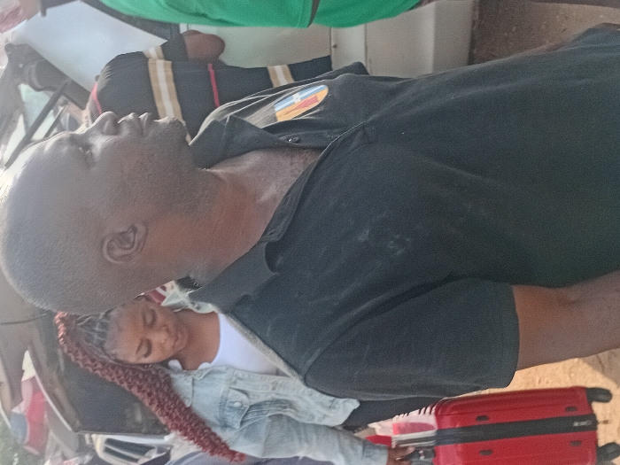 A man in a black shirt is seen from the chest up, seemingly in a car. A woman with long reddish-brown braids is next to him, wearing a white top and denim jacket. A red suitcase is beside them. Other individuals and vehicles are in the periphery, hinting at a travel setting. The scene is captured in daylight.