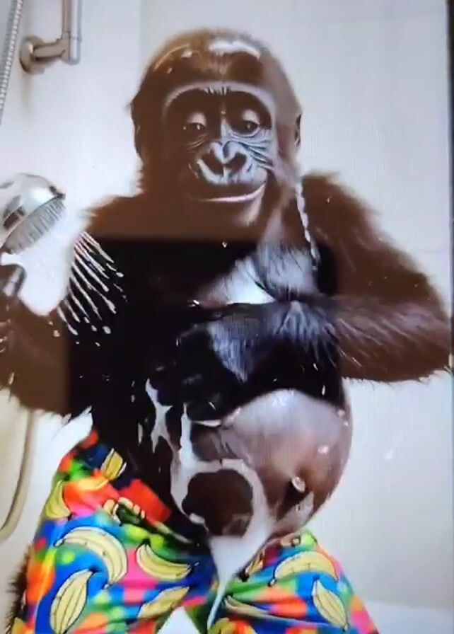 A video shows a simulated gorilla wearing colorful banana-themed shorts taking a shower