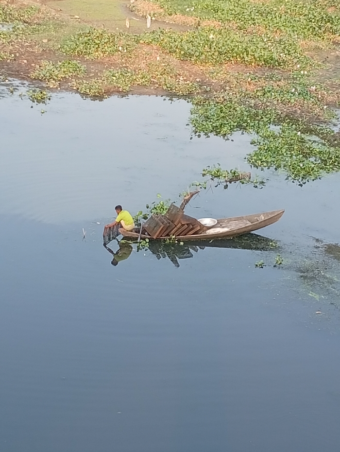 A single male individual is depicted in a wooden boat on a body of water in Unknown, Bangladesh