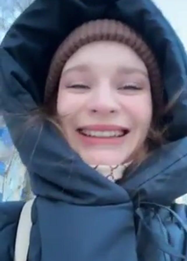 A woman wearing a blue hooded jacket and a brown beanie is recording a selfie video outside. She says hello and good morning, and then smiles broadly. There are trees and a building in the background. It appears to be a cold, possibly snowy day. She has on light makeup, including eyeliner and lipstick. She is also wearing a patterned scarf.