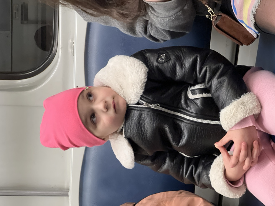 An indoor, eye-level shot inside a subway car in Shushary, Russia, focuses on a young child seated on a blue upholstered bench. The child, estimated to be a girl, wears a bright pink beanie, a black faux-leather jacket with a white faux-fur collar and cuffs, and light pink trousers. Her hands are clasped together on her lap, and her gaze is directed towards the upper right side of the frame. To the child's immediate right, the left arm and torso of another individual are partially visible, wearing a grey hooded top and a small brown shoulder bag with a gold clasp. The subway car's interior features light-colored walls above the blue seating, and a window reflecting the interior is present in the background. A horizontal metal grab bar runs along the wall. The lighting is artificial.