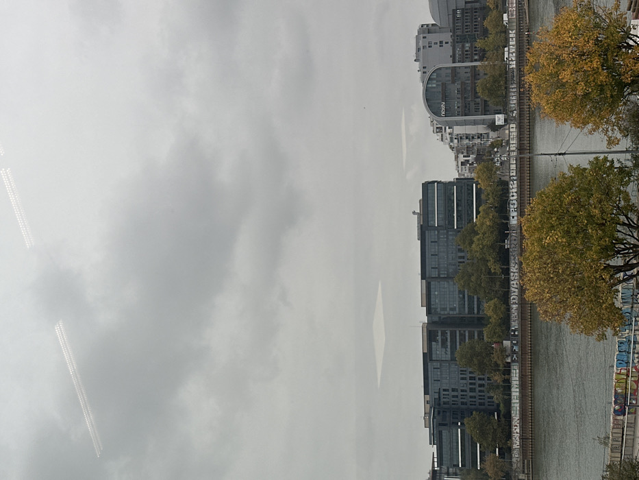 The image displays an urban riverfront scene in Saint-Ouen-sur-Seine, France, under an overcast sky. The view is likely from indoors, evidenced by two parallel rows of reflected white lights in the upper sky portion. In the foreground, two trees with bright yellow-orange autumn foliage partially obstruct the lower frame. Below them, a concrete retaining wall on the river's near bank features extensive, multi-colored graffiti. A dark, calm river, identified as the Seine, occupies the midground, flowing horizontally across the image. A slender dark pole or cable extends vertically near the center-right foreground. On the opposite bank, a line of deciduous trees, mostly green and brown, separates the river from a series of modern office buildings. Prominent among these is a large, dark-paneled building on the left, characterized by numerous rectangular windows. To its right, a distinctive multi-story building with a curved, lighter facade displays the "nexity" logo. Further right, additional urban buildings with various grey tones and window configurations are visible. A road with scattered vehicles runs in front of these buildings, behind a graffiti-covered wall or barrier featuring large white and black text. The sky is uniformly grey and overcast, with a slightly lighter, horizontally elongated oval cloud formation visible above the left-center buildings. The overall environment is a contemporary urban landscape along a major waterway, devoid of discernible human activity or interactions.