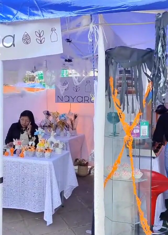The camera pans across a vendor’s stall set up under a blue tarp. At the left, a woman stands behind a table covered with a white lace tablecloth, appearing to talk on her phone. The stall is labeled “Nayara” with a logo featuring a leaf and a bottle. Other vendors are inside the stall. One woman wearing jeans places an item on a red stool, while a man sitting on a stool appears to be adjusting something with his hands. A glass display case is decorated with orange Halloween decorations. The back of the stall features another table with various bottles, cups, and decorations. The background shows a partially cloudy sky and the tops of trees. Music is audible.