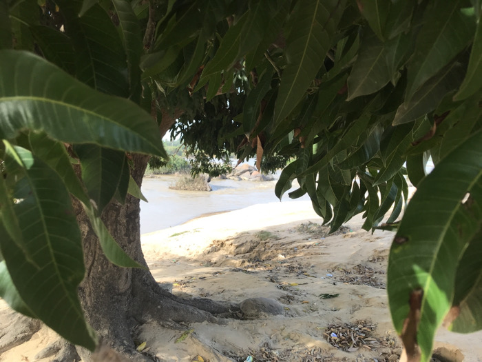 The scene depicts a natural outdoor environment in Rido, Nigeria. A large tree with dense green foliage occupies the immediate foreground and left, its textured trunk and exposed roots visible in the sandy soil. The ground leading to a body of water is sandy, showing areas of erosion and containing scattered dry leaves and minimal debris. A calm, brownish body of water, consistent with a river or large stream, flows across the midground. Several small, vegetated landmasses or rock formations are present within the water. A distant, lightly vegetated landmass forms the background. Natural daylight illuminates the scene, casting dappled shadows from the tree canopy. No human subjects, animals, or significant man-made structures are visible.
