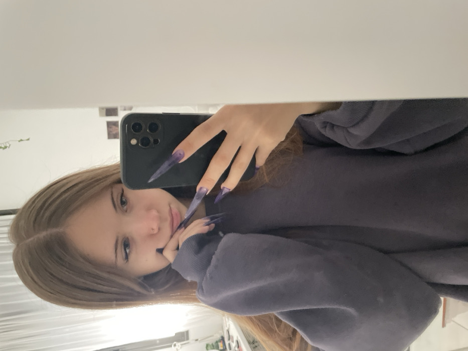 A young female with long, straight light brown hair, parted centrally, is depicted from the chest up in a mirror selfie. She has a subtle nose piercing on her right nostril and a neutral to slightly melancholic expression with a faint pout. She is wearing an oversized, dark grey/charcoal long-sleeved sweatshirt. Her left hand, featuring long, sharply pointed (stiletto) purple acrylic nails, rests against her cheek. Her right hand holds a dark-colored smartphone, likely an iPhone due to its triple camera array visible in the reflection, positioned to capture the image. The background, also a reflection, reveals an indoor setting with white walls. To the left, a window covered by sheer white curtains is visible, beneath which sits a desk or table holding various indistinct objects, including a vertical, spiky decorative item and a small green plant. Framed pictures are mounted on the white wall behind the subject's head. A small trailing plant hangs from a higher point in the room. The scene is located in Raanana, Israel.