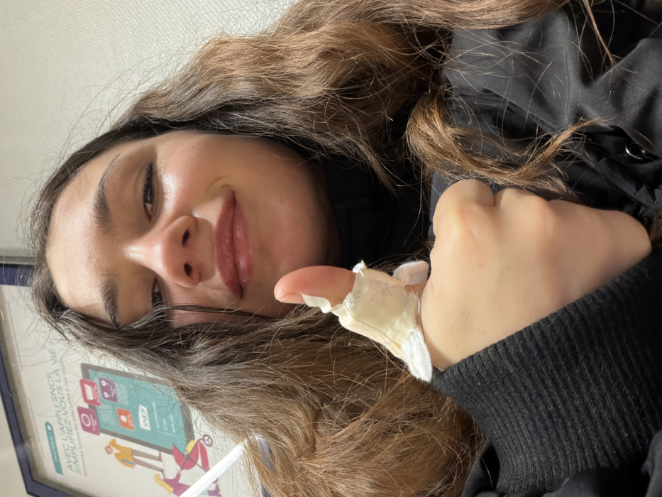 A person with long, wavy brown hair wears a black sweater and displays a thumbs-up, though their thumb is heavily bandaged