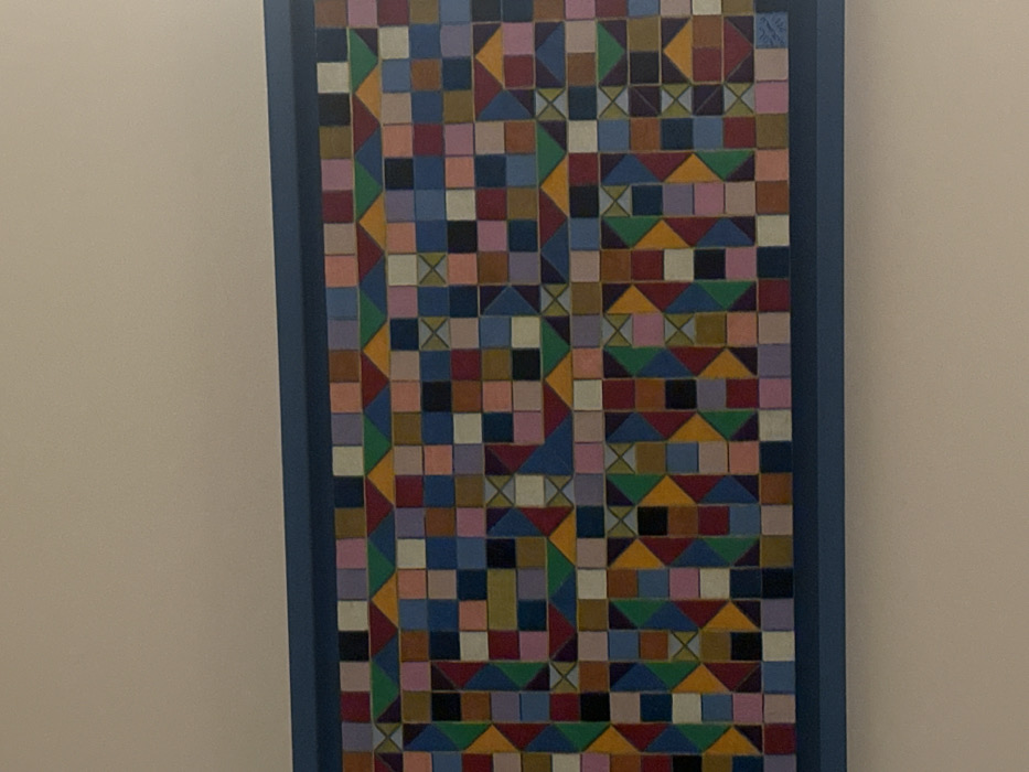 A framed piece of geometric art hangs against a light wall. The artwork consists of a grid pattern of small squares and triangles in various colors including blues, reds, greens, yellows, purples, and blacks. Some squares have an "X" pattern inside. The artwork's border is a solid, dark blue.