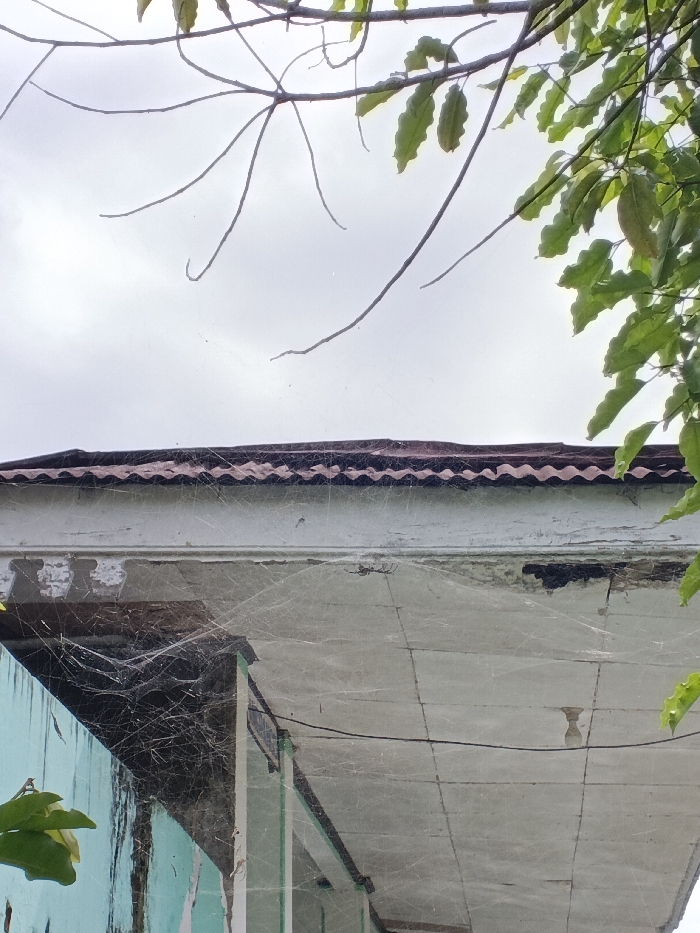 The weathered building shows visible signs of age and disrepair, notably peeling paint. A significant, dusty spiderweb obscures a portion of the facade. A lightbulb fixture hangs from the ceiling. The roof has curved red tiles. Tree branches and foliage frame the image, with a cloudy sky visible in the background. The overall setting evokes a sense of neglect.