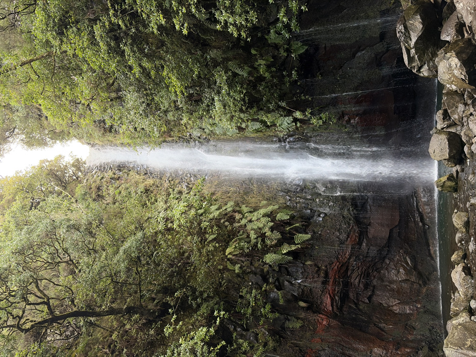 An image depicts a tall, narrow waterfall cascading within a verdant, rocky gorge in Calheta, Portugal