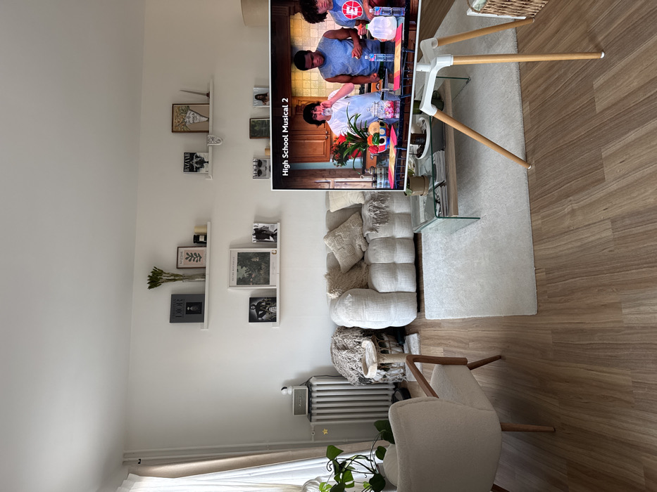 This image depicts a modern living room interior located in Paris, France. The room features light wood-look laminate flooring and white walls, illuminated by natural light entering from a large window on the left, fitted with light-colored curtains. In the foreground on the left, a cream-colored armchair with wooden arms and legs is visible. Behind it, a green potted plant sits on a white stand. A white radiator is positioned against the wall, topped by a small white electronic device and a Marshall speaker. Adjacent to the radiator, a multi-tiered cat tree is partially covered by a beige throw blanket. In the background, an off-white, modular sofa is furnished with several textured cushions and a beige throw blanket. Above the sofa, two white floating shelves are mounted on the wall. The top shelf displays a "DIOR" book, a vase with green foliage, a "MATISSE" art print, and a black candle. The lower shelf holds a black and white print, a "HENRI ROUSSEAU" art print, and a "VOGUE" magazine. A clear glass coffee table with a light wooden base is situated in the center, resting on a rectangular white rug. Objects visible on the table include books and a small potted plant. To the right, a television mounted on a white and light wood tripod stand displays a scene from "High School Musical 2." The screen shows three young males in a kitchen setting: one in a white shirt is drinking from a clear glass, another in a blue tank top holds a red can, and a third in a blue t-shirt with a red "E" logo is present. The kitchen counter features colorful bowls, a red potted plant, candy in clear jars, and plastic water bottles. The room presents a clean, contemporary aesthetic.