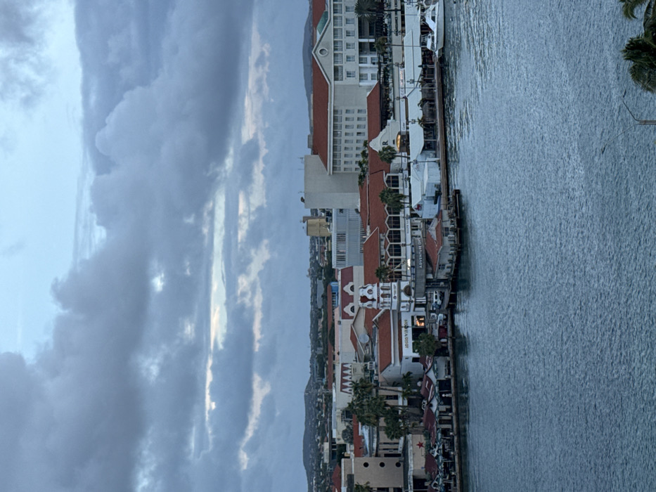 The image presents an elevated view of the waterfront and urban landscape of Oranjestad, Aruba, under an overcast sky. In the foreground, a dark blue body of water exhibits subtle ripples. The midground displays a densely developed coastline featuring a mix of architectural styles. A prominent white building with a distinctive multi-tiered, red-roofed tower, possibly a clock tower, is centrally located near the water, with a "LOUIS VUITTON" sign visible on its facade. To its left, a cluster of smaller, rustic-appearing structures with light-colored roofs borders the water. To its right, an "ADVENTURE ODC" sign is mounted on a pier structure where several cars and vans are parked. Further right, a large, multi-story white building with a terracotta roof, resembling a hotel, stands behind other commercial establishments. Several white leisure boats are docked at the pier on the far right. Palm trees are scattered throughout the built environment. The background shows an expansive urban area extending towards low, distant hills. The sky is largely covered by heavy, grey clouds, with a strip of lighter blue and pale light visible near the horizon. No specific individuals or their actions are clearly discernible within the frame.