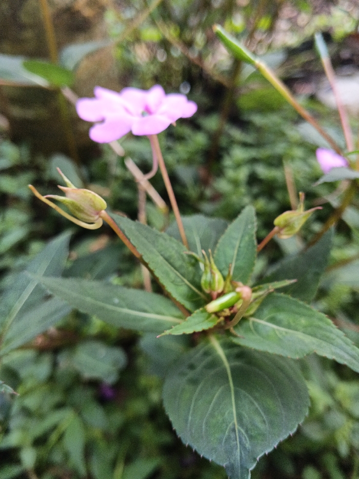 A close-up shows a light purple flower with delicate petals. The flower is among green foliage, featuring numerous green leaves and unopened flower buds. Some buds are closed, while others show small, developing petals. The background is blurry, suggesting a natural outdoor setting with other plants and foliage out of focus. The overall impression is one of fresh growth and natural beauty.