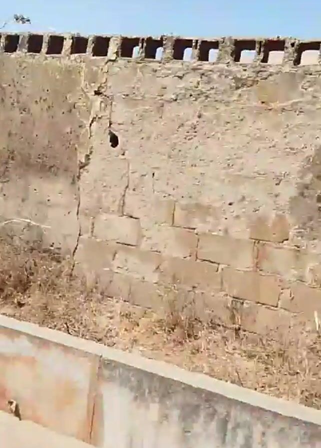 long, weathered wall with regular square openings at the top, reminiscent of a fort or defensive structure. The wall is made of a rough, light brown material, likely stone or concrete, with dark stains and patches. In front of the wall is dry, weedy vegetation. A concrete curb runs along the bottom of the frame, next to a paved surface, suggesting the video was taken from a moving vehicle driving alongside the wall. The sky is clear and blue. The camera appears to be moving, causing the scene to shift gradually.