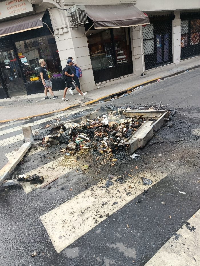 A burnt-out pile of trash sits in the middle of a crosswalk. Debris, possibly from a dumpster, is scattered around the street, which has black streaks running through it. Three individuals walk on the sidewalk toward a building with awnings and storefronts. The street appears to be slightly inclined.