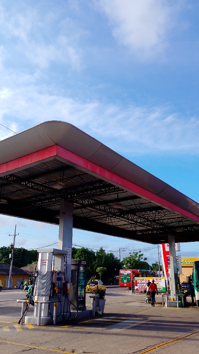 A gas station with a large, red-trimmed gray canopy stands under a bright, partly cloudy sky. Gas pumps are visible in the foreground. In the background, there's a street scene with cars, people, and buses, including a red and green bus. The scene is daytime.