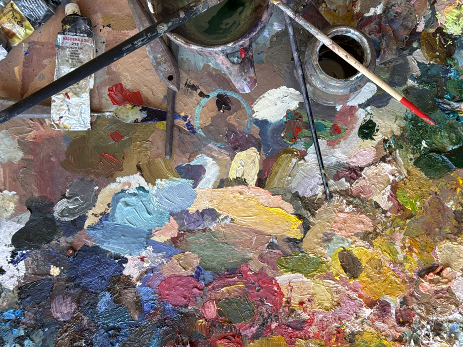 An overhead view captures an artist's heavily used wooden palette within a workspace in Veliko Tarnovo, Bulgaria
