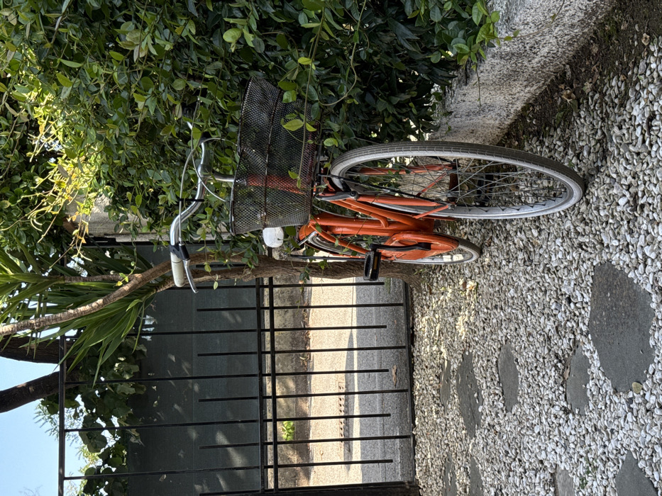 - "In Montignoso, Italy, an orange step-through frame bicycle stands on a gravel path, leaning against a slender tree trunk" by FM-Y7gNB3, licensed under CC BY 4.0
