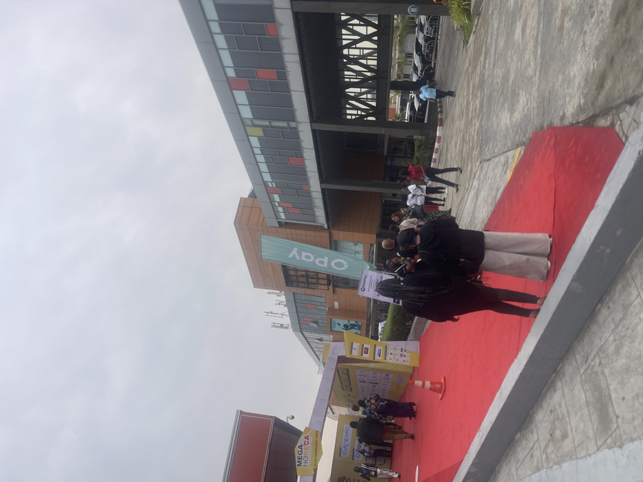 An outdoor scene in Alaguntan, Nigeria, depicts an event entrance in front of a modern, multi-story building under an overcast sky. A prominent red carpet extends diagonally from the lower left foreground towards the building's main entrance on the left. To the left of the carpet, a red canopy structure with a mounted CCTV camera is visible, alongside multiple event banners. One banner partially reads "MEGA HORECA 10-12 FEBRUARY 202X", and "OPAY" is visible on another. Approximately 20-30 individuals are present. Two individuals, viewed from behind, walk on the red carpet in the foreground; one wears dark clothing, the other a dark top and light-colored wide-leg trousers. Other attendees, dressed in varied casual and semi-formal attire, move along the carpet towards the building. A group of people are gathered to the right of the carpet, near a banner featuring "Opay" and "Omnipay" branding. One person in a red top stands facing this group. A child in a light blue top is seen walking away from the building on the far right. The building features a brown and grey facade with large windows incorporating colored panels (red, yellow, grey). A large vertical "Opay" banner in a light blue/green color hangs on the building's exterior. Antenna-like structures are visible on the roof. An overhang supported by dark columns covers a paved driveway or parking area to the right, where several dark-colored vehicles are parked behind metal barriers. Green foliage is visible between the building and the paved area. An orange traffic cone is on the red carpet.