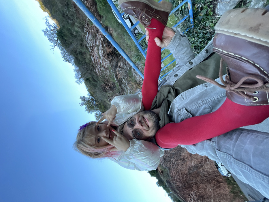 A man and a young girl pose outdoors with a blue sky backdrop. The girl, with blonde hair and a purple bow, flashes a peace sign. Red-clad legs, ending in brown boots, stretch above them. The man, wearing round glasses, smiles while holding the boots. They are on a metallic structure with a cliff visible behind them.