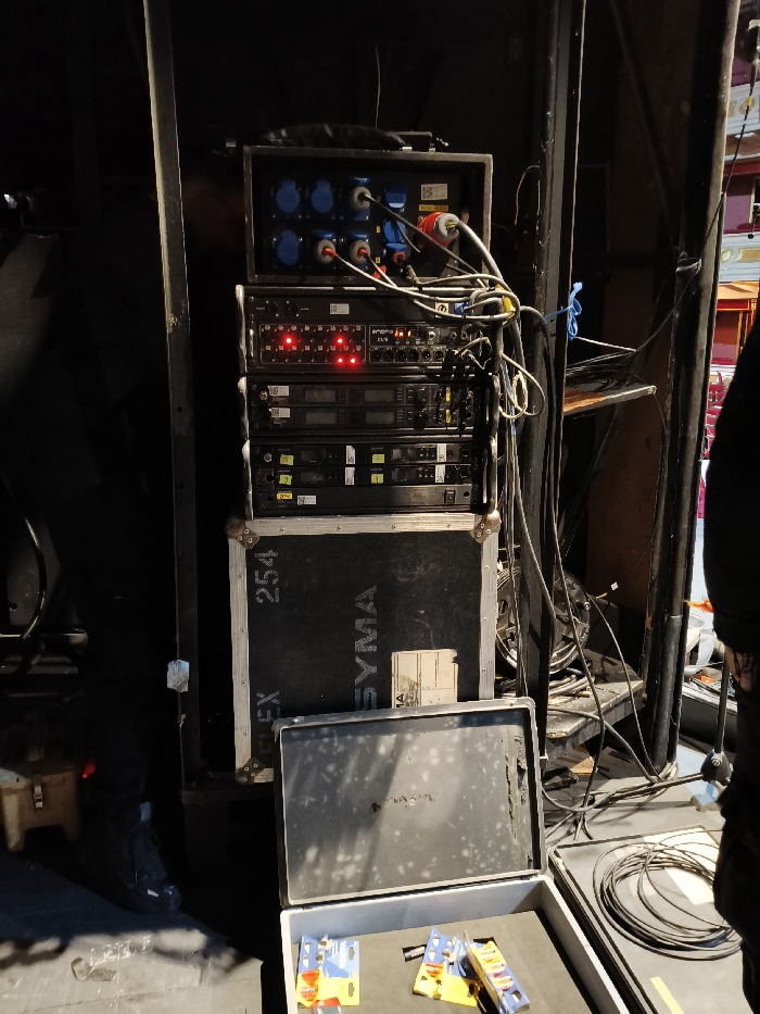 The image depicts a cluttered technical setup in a backstage area of a venue in Unknown, Unknown