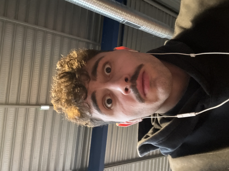 A young adult male, of light complexion with dark curly hair and a prominent dark mustache, stares directly at the camera with wide-open eyes, displaying a surprised expression. He is wearing a dark hooded sweatshirt and white wired earbuds are inserted into both ears, with the wires visible. The background reveals an indoor environment with a corrugated metal ceiling, a horizontal blue beam, and a silver cylindrical ventilation duct. A white rectangular fixture is visible on the ceiling. The scene is located in Chantepie, France.