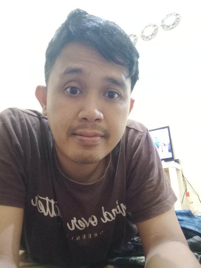 A medium shot of a man with dark hair, wearing a brown t-shirt. His hair is neatly styled, and he has a thin mustache. His expression is somewhat neutral, with wide, dark eyes. Behind him, a television sits on a table. The background is a plain white wall, adorned with a few decorative circular objects near the top. Some clothing or fabric is visible below his torso, near the bottom of the frame.