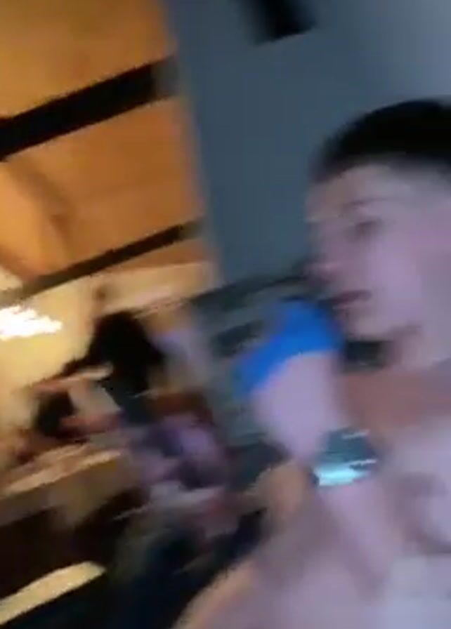 interior of a room, possibly a common area in a cabin or rustic-style house, where a group of young men are gathered. The camera is handheld, often shaky, and appears to be filming the scene from a low angle, as if the person holding it is sitting or lying down. The room is characterized by a high, pitched wooden ceiling with exposed beams and several light fixtures that provide warm illumination. In the background, a group of people are standing around a long table. They appear to be celebrating, perhaps preparing drinks or engaging in general merriment. Some are holding bottles, and there are several items on the table. The camera then focuses on two young men in the foreground. The man in the foreground is shirtless, with the camera focused on his torso and a watch on his left wrist. He is interacting with another man who is standing beside him, wearing a jacket. There is a brief close-up of their faces. The other man is also young, and appears to be talking to the shirtless man. The video shows various angles of the room with the group of men, capturing the casual and festive atmosphere. The camera is held by someone wearing blue gloves.