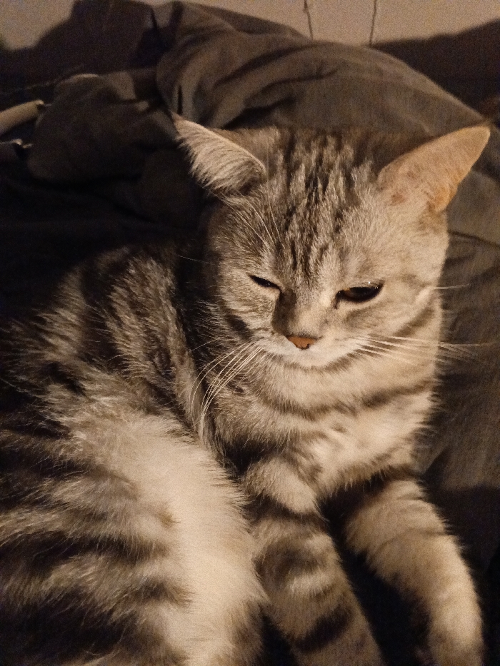 - "A grey tabby cat with dark stripes rests on a grey surface" by FM-Zwv733, licensed under CC BY 4.0