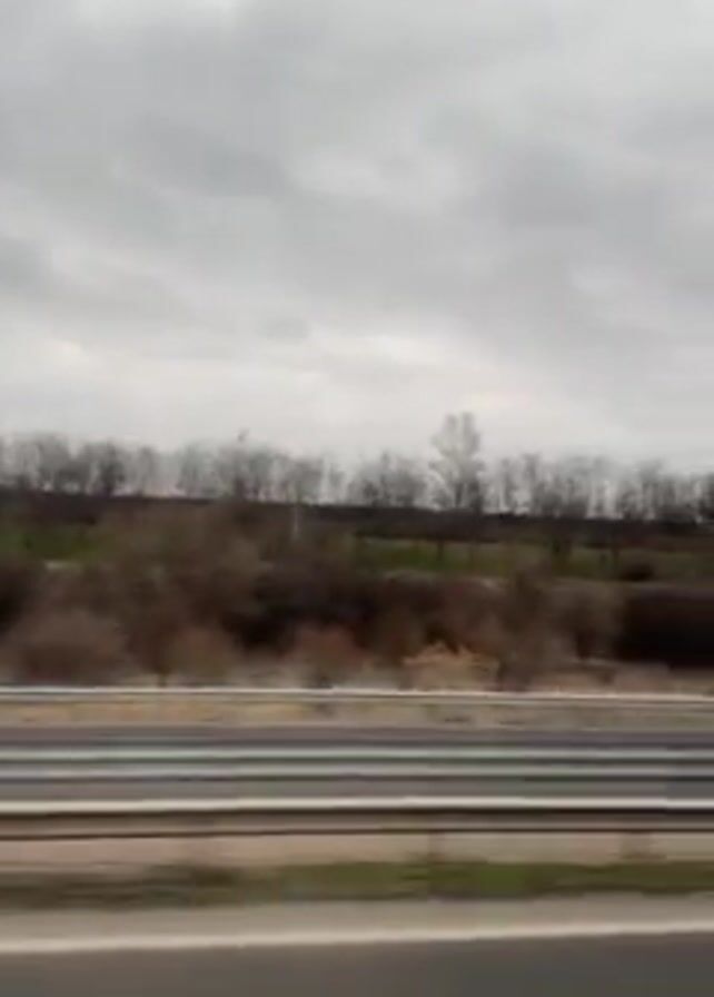 The video, shot from inside a moving vehicle, shows a landscape viewed from a highway. The sky is overcast and gray. A green field is visible behind a thicket of brown bushes and leafless trees. A metal guardrail runs parallel to the road. A yellow van drives in the opposite direction. The video continues to show the view of the countryside as the vehicle progresses.