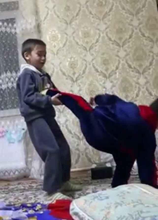 Two young boys are in a room with patterned wallpaper and a patterned rug. One boy is wearing a navy blue tracksuit with red stripes, and the other is wearing a grey tracksuit. The boy in the navy blue tracksuit attempts to kick the boy in grey. The boy in grey grabs the boy in navy blue by the leg and pulls, causing him to fall forward in a bent-over position. The boy in grey laughs. The boy in navy blue falls over.