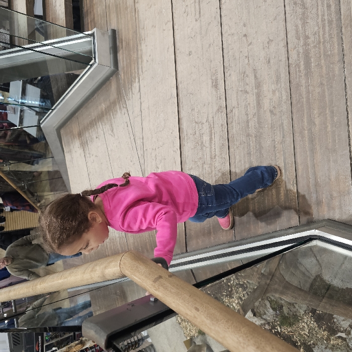 A young girl in a pink sweater and blue jeans is doing push-ups on a wooden floor. She's using a wooden handrail as a support. Her hair is braided. To the left and right are glass barriers. In the reflection of the glass, parts of a store can be seen, including clothing racks and other shoppers.