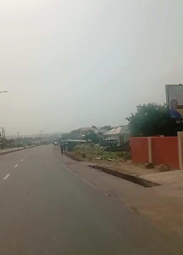 A point-of-view shot travels along an asphalt road with white lane markings. The road is largely empty save for some distant vehicles. A sidewalk runs alongside the road to the right. A few people are walking on the sidewalk. The landscape includes buildings, trees, and a billboard with political images, all visible in the distance. The sky is overcast. The video appears to have been taken from a moving vehicle or bicycle.