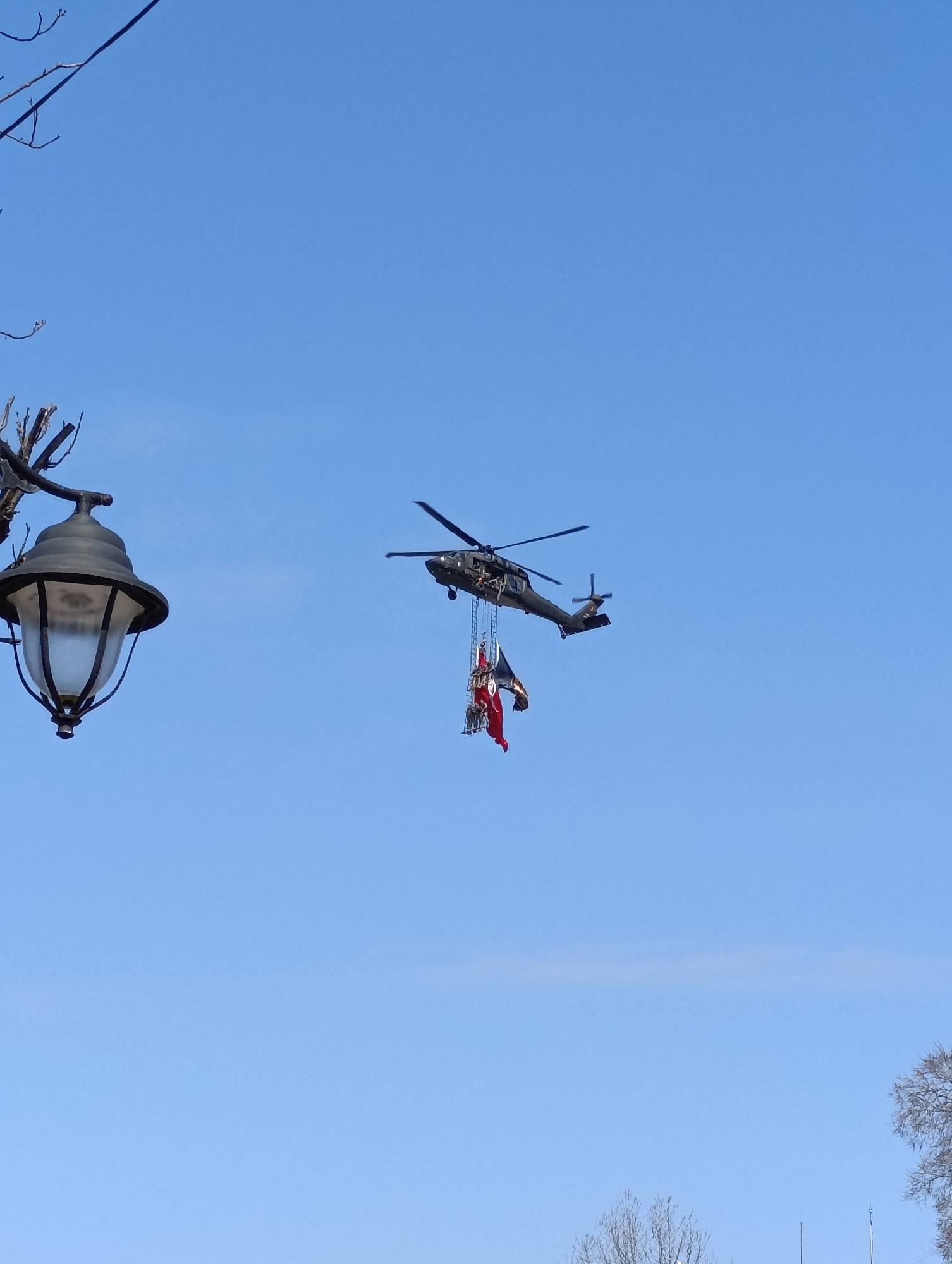 A black Sikorsky UH-60 Black Hawk helicopter flies in a clear blue sky with a ladder hanging from its side. Two people in red clothing are on the ladder, one holding the flag of Turkey. A black street lamp and some tree branches are on the left side of the image. Trees and an antenna are on the lower right side of the image. The scene depicts a celebration in the city of Istanbul, Turkey.