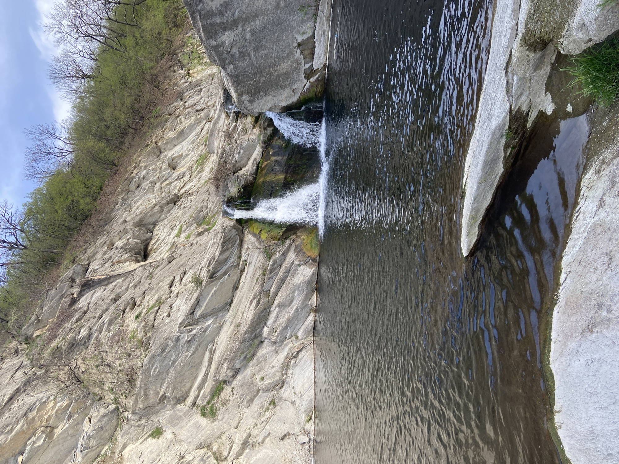 waterfall in Kapinovo, Bulgaria. Water cascades down a rocky cliff face into a pool. The cliff is gray and rugged with sparse vegetation. Trees with budding green leaves line the top of the cliff. The water in the pool is dark and rippled. Large rocks are present on either side of the waterfall and pool.
